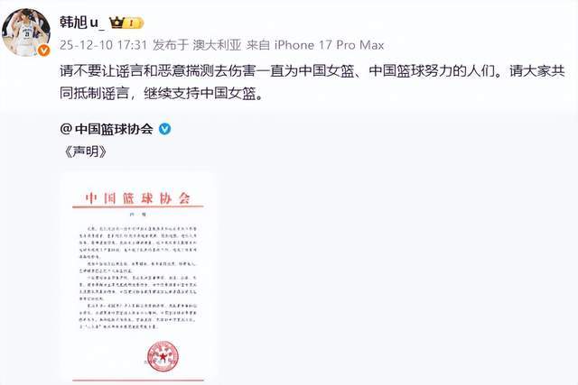 看到中国篮协发布了声明,远在澳大利亚打球的韩旭也站出来了,她转发了中国篮协的声明,并且写道:“请不要让谣言和恶意揣测去伤害一直为中国女篮、中国篮球努力的人们。请大家共同抵制谣言,继续支持中国女篮。”